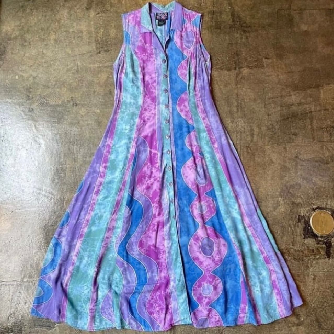 This dress features beautiful purple-based coloring and batik-like wax-resist dyeing.